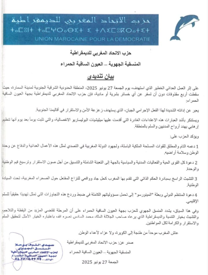 أدان حزب الاتحاد المغربي للديمقراطية، في بيان صادر عن منسقيته الجهوية بجهة العيون الساقية الحمراء، الهجوم الصاروخي الذي استهدف صباح اليوم الجمعة المنطقة الشرقية الجنوبية لمدينة السمارة، واصفًا إياه بـ”العمل العدائي الجبان” الذي يسعى إلى زعزعة الأمن والاستقرار في الأقاليم الجنوبية للمملكة.