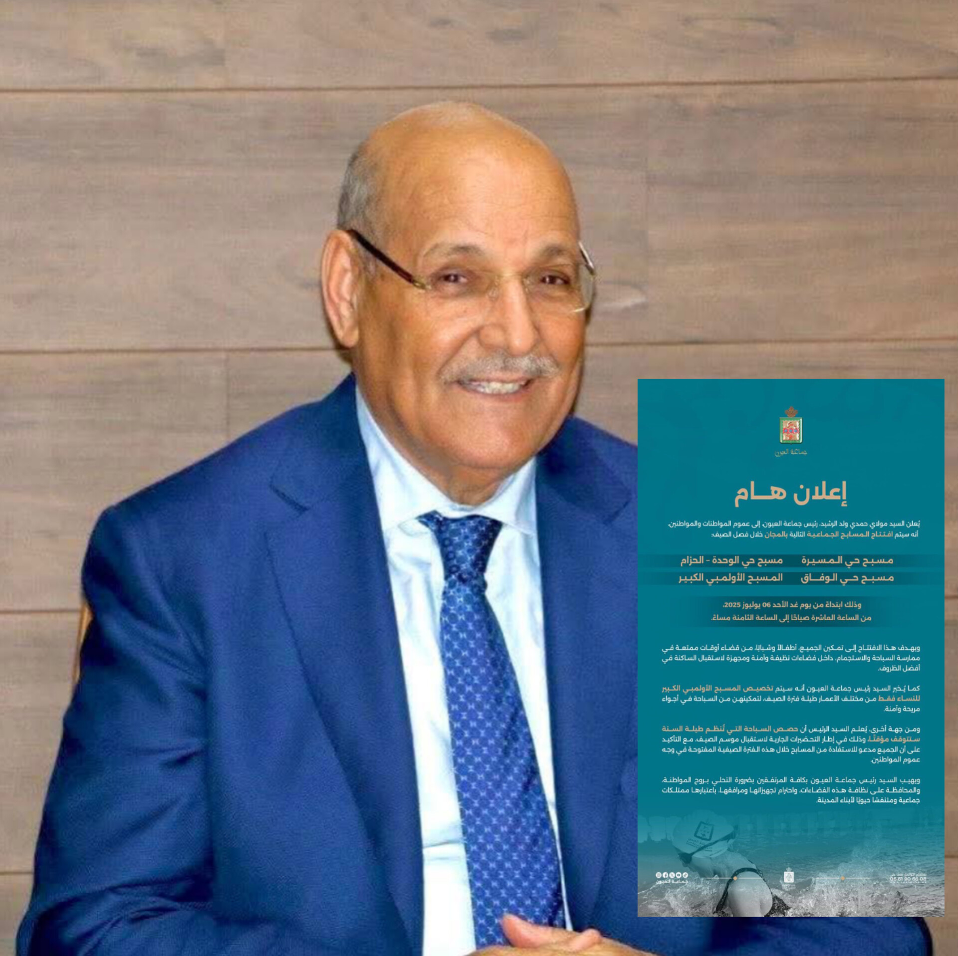 في خطوة تستحق كل الشكر والتقدير، أعلنت جماعة العيون، برئاسة السيد مولاي حمدي ولد الرشيد، عن فتح المسابح الجماعية مجاناً في وجه عموم المواطنين طيلة فصل الصيف، ابتداءً من يوم الأحد 6 يوليوز 2025، وذلك من الساعة العاشرة صباحاً إلى الثامنة مساءً.