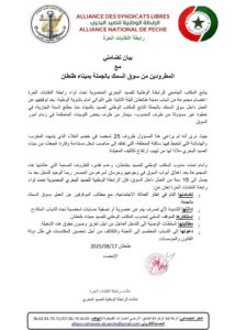 أصدرت الرابطة الوطنية للصيد البحري المنضوية تحت لواء رابطة النقابات الحرة بياناً تضامنياً مع مجموعة من الشباب المطرودين من العمل داخل سوق السمك بالجملة بميناء طانطان، والذين دخلوا في اعتصام مفتوح منذ ليلة السبت احتجاجاً على ما وصفوه بـ”الطرد التعسفي وغير المبرر”.