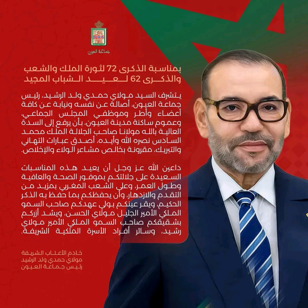 بمناسبة الذكرى الثانية والسبعين لثورة الملك والشعب، والذكرى الثانية والستين لعيد الشباب المجيد، وجّهت جماعة العيون برئاسة مولاي حمدي ولد الرشيد، أصالة عن نفسه ونيابة عن أعضاء المجلس الجماعي وموظفيه وساكنة المدينة، برقية ولاء وإخلاص إلى صاحب الجلالة الملك محمد السادس نصره الله وأيده.