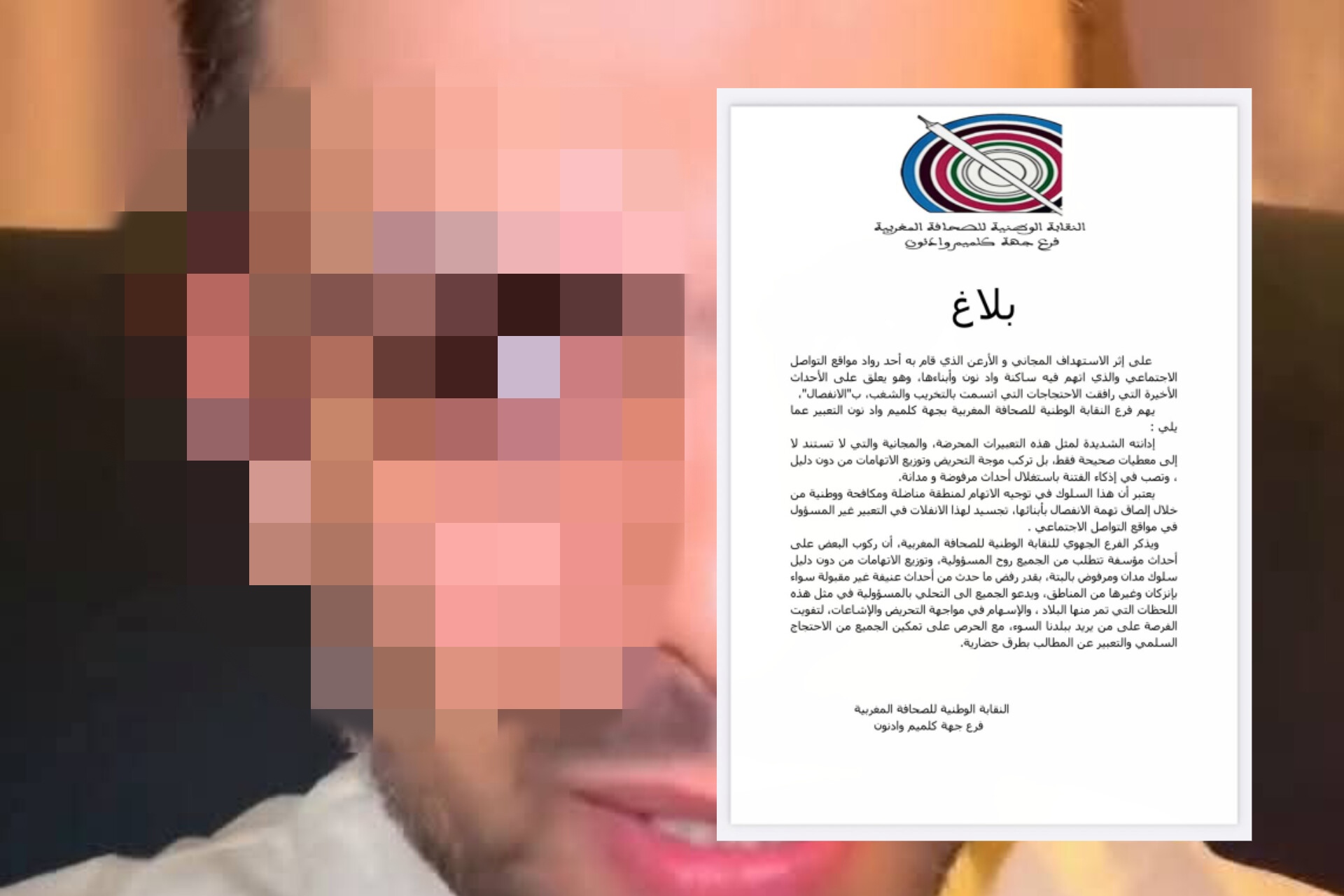 أصدر فرع النقابة الوطنية للصحافة المغربية بجهة كلميم وادنون بلاغًا شديد اللهجة، استنكر فيه ما وصفه بـ”الاستهداف المجاني والأرعن” الذي أقدم عليه أحد رواد مواقع التواصل الاجتماعي، بعد نشره تدوينة اتهم فيها ساكنة وادنون وأبناءها بالانفصال، على خلفية الأحداث التي شهدتها المنطقة مؤخرًا.
