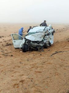 وقعت في الساعات الاولى من صباح اليوم الخميس حادثة سير مميتة بعد اصطدام مباشر بين سيارتين خفيفتين على مستوى الطريق الوطنية رقم 1 بين العيون و بوجدور .