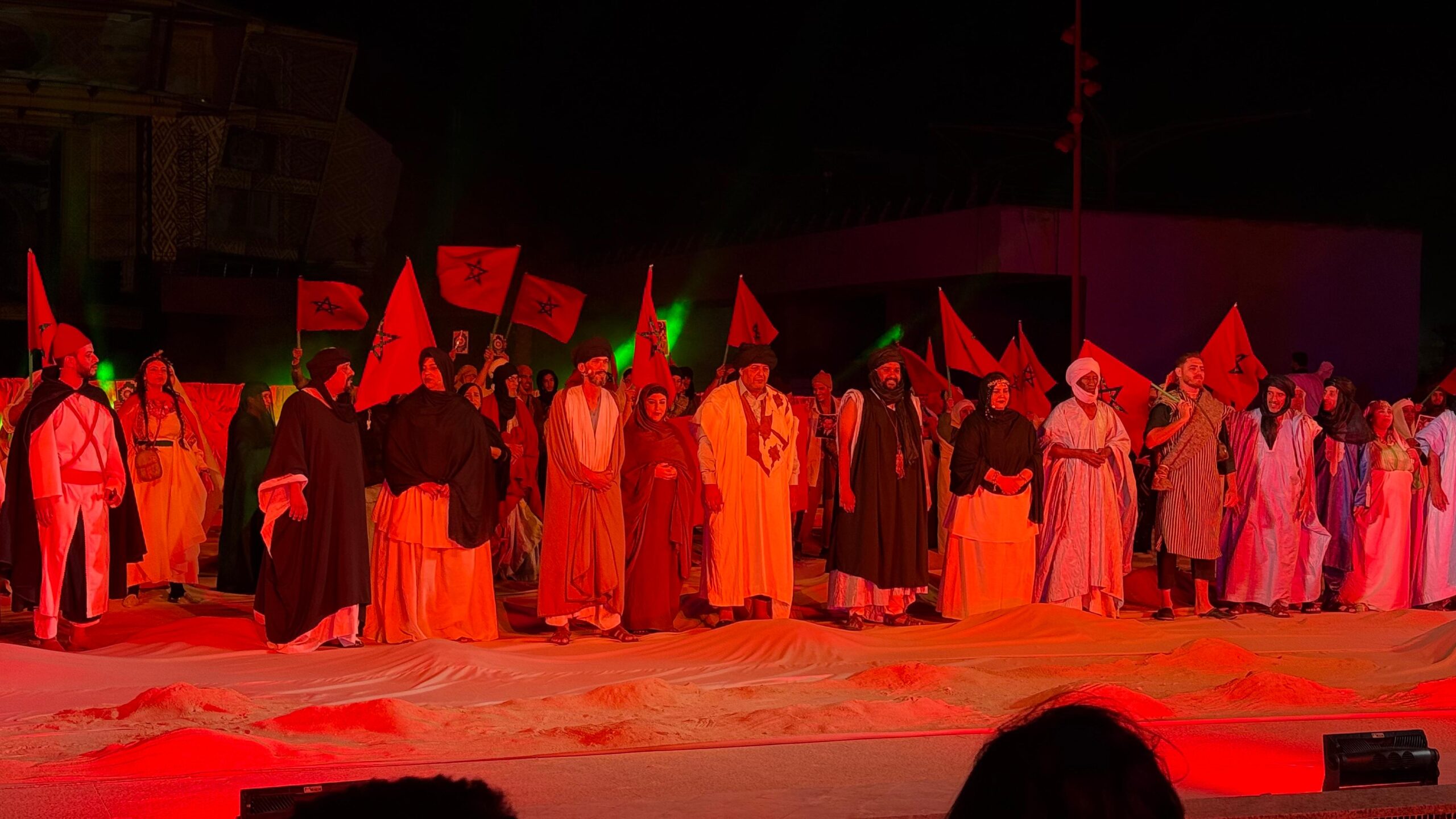 وقدّم العرض، من خلال مقاربة سينوغرافية معاصرة، لوحات فنية مبهرة جمعت بين التمثيل والموسيقى والرقص والإضاءة، مسافرة بالجمهور في رحلة فنية وعاطفية استحضرت قيم الوفاء والوحدة التي شكلت جوهر ملحمة المسيرة الخضراء، ومؤكدة على دور الفن في ربط الماضي بالحاضر.