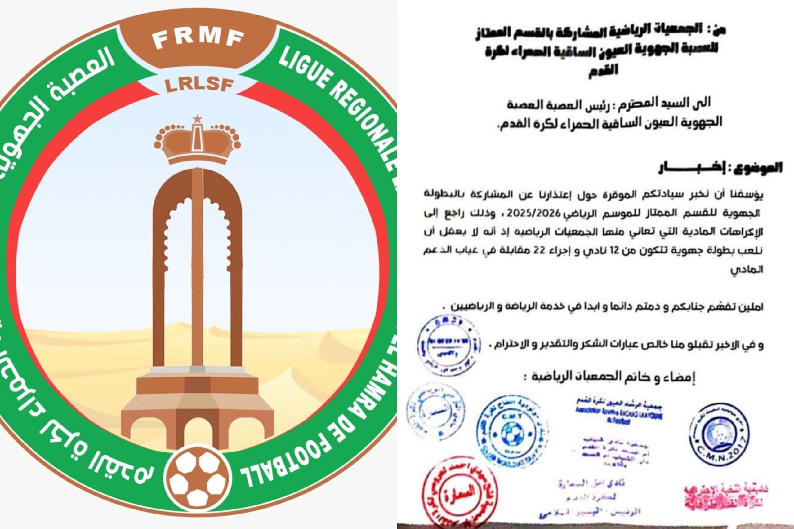 في خطوة غير مسبوقة على الساحة الرياضية الجهوية، أعلنت أندية القسم الممتاز لكرة القدم بجهة العيون الساقية الحمراء عن اعتذارها الجماعي عن المشاركة في منافسات الموسم الرياضي 2025/2026، وذلك احتجاجاً على غياب الدعم المالي الذي كانت العصبة الجهوية قد التزمت بصرفه قبل انطلاق البطولة.