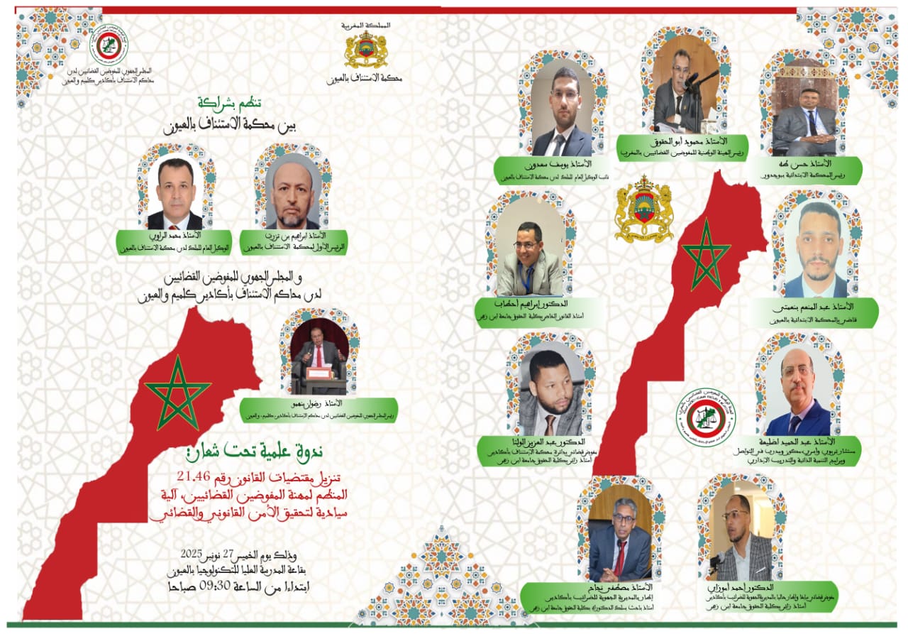 تحت شعار: “القانون رقم 21.46 المنظم لمهنة المفوضين القضائيين بين الحصيلة وأهداف تحقيق الأمن القانوني والإجرائي”، تنظم محكمة الاستئناف بالعيون بتعاون وشراكة مع المجلس الجهوي للمفوضين القضائيين لدى محاكم الاستئناف بأكادير وكلميم والعيون ندوة علمية كبرى، يوم الخميس 27 نونبر 2025، وذلك بـ المدرسة العليا للتكنولوجيا بالعيون.