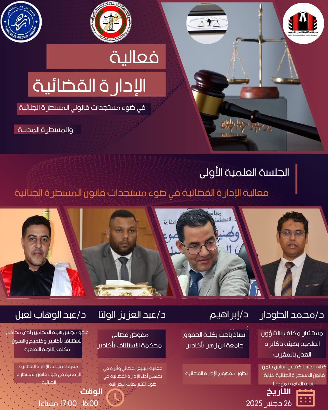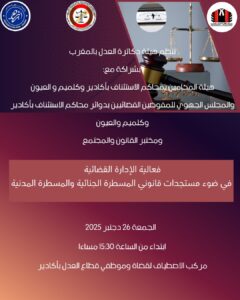 تحتضن مدينة أكادير، يوم الجمعة 26 دجنبر 2025، ندوة علمية وطنية حول موضوع «فعالية الإدارة القضائية في ضوء المسطرة الجنائية والمسطرة المدنية»، وذلك بمركب الاصطياف لقضاة وموظفي قطاع العدل، ابتداءً من الساعة الثالثة بعد الزوال، في إطار الانفتاح على القضايا الراهنة المرتبطة بتطوير منظومة العدالة بالمغرب.
