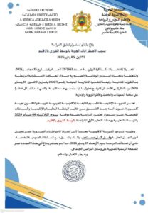 وأكد البلاغ أن هذا القرار تم اتخاذه بعد التنسيق مع خلايا اليقظة المحلية والإقليمية والسلطات المختصة، في إطار الحرص على ضمان السلامة العامة كما دعت المديرية إلى تفعيل أدوار اللجان المحلية واتخاذ الاحتياطات اللازمة، مع متابعة المستجدات بشكل مستمر.