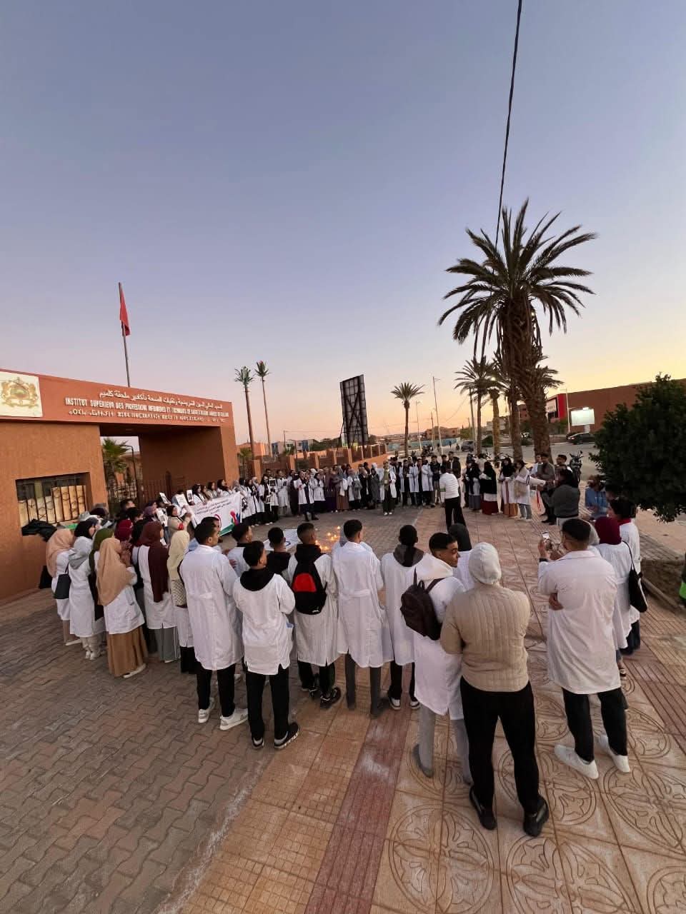 خاض طلبة المعهد العالي للمهن التمريضية وتقنيات الصحة بكلميم، يوم أمس، وقفة احتجاجية سلمية أمام مقر المعهد، عبّروا من خلالها عن استيائهم العميق من الأوضاع التي يعيشونها، واحتجاجهم على تأخر الاستجابة لمطالبهم المشروعة من طرف الجهات المعنية.