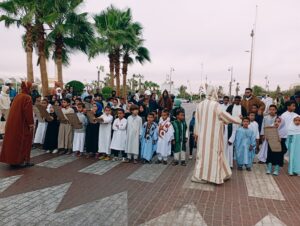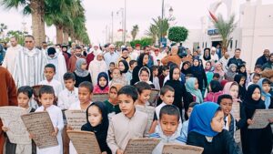 وقد ردد السائرون في ذات الموكب أدعية الاستسقاء، في أجواء روحانية ودينية، حيث كانت بداية الموكب من أمام قصر المؤتمرات إلى مسجد مولاي عبد العزيز حيث تمَّ أداء جموع المصلين صلاة الاستسقاء متضرّعين إلى الباري عز وجل بالدُّعاء والاستغفار، وأن يَسقِي عبادهُ وبهيمته، ويَنشر رحمته، ويُحيي بلدهُ الميِّت.
