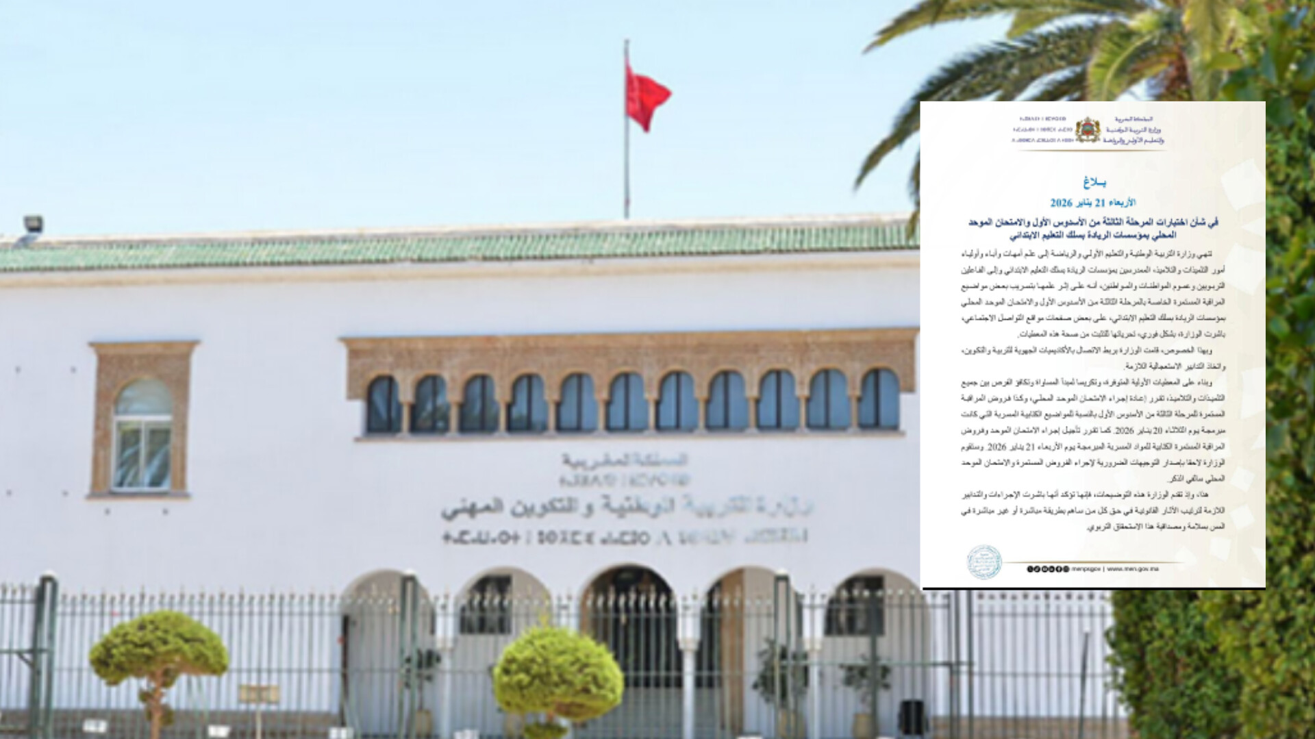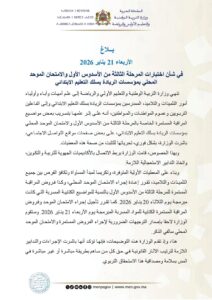 أعلنت وزارة التربية الوطنية والتعليم الأولي والرياضة، يوم الأربعاء 21 يناير 2026، عن حزمة من الإجراءات الاستعجالية على خلفية تسريب مواضيع تخص اختبارات المرحلة الثالثة من الأسدوس الأول والامتحان الموحد المحلي بمؤسسات الريادة بسلك التعليم الابتدائي.