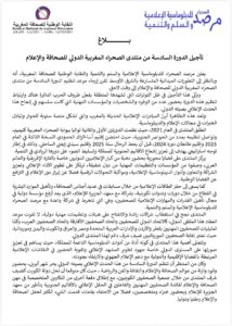 أعلن مرصد الصحراء للدبلوماسية الإعلامية والسلم والتنمية، بشراكة مع النقابة الوطنية للصحافة المغربية، عن تأجيل الدورة السادسة لمنتدى الصحراء المغربي الدولي للصحافة والإعلام إلى موعد لاحق، وذلك في ظل التطورات الميدانية المتسارعة التي تشهدها منطقة الشرق الأوسط وما تفرضه من ظروف استثنائية.