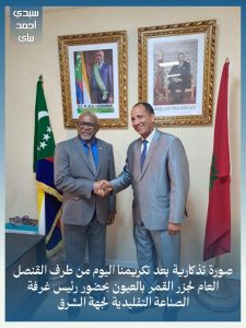 تم بالأمس تكريم السيد سيدي أحمد بياي عضو غرفة الصناعة التقليدية بجهة العيون الساقية الحمراء ، من طرف القنصل العام لجزر القمر بالعيون بحضور رئيس غرفة الصناعة التقليدية لجهة الشرق .