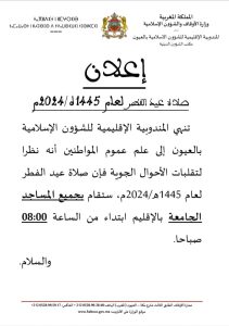 أصدرت المندوبية الإقليمية لشؤون الإسلامية بالعيون بلاغ إلى عموم المواطنين تخبره فيه أنه ونظرا لتقلبات الأحوال الجوية ستكون صلاة العيد بمدينة العيون بجميع المساجد الجامعة ابتداءا من الساعة 8 صباحا .