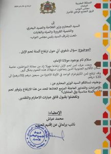 وتفاعلاً مع الموضوع و نظراً لآنيته توجه السيد محمد عياش النائب البرلماني عن إقليم العيون بسؤال شفوي أول أمس الاربعاء 24 أبريل 2024 إلى السيد المحترم وزير الفلاحة و الصيد البحري و التنمية القروية و المياه و الغابات – تحت إشراف السيد رئيس مجلس النواب – حول إرتفاع أثمنة لحم الإبل ، وكذا عن الإجراءات العاجلة المزمع اتخاذاها للحد من هذا الارتفاع وتوفير لحم الإبل بأثمنة مناسبة و في المتناول.