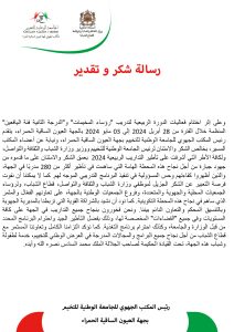رسالة شكر وتقدير لكافة الأطر التي أشرفت على تأطير التداريب الربيعية 2024 بجهة العيون الساقية الحمراء