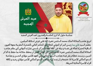 يتشرف السيد علي بيدا ، رئيس المركز الدولي للدفاع عن الحكم الذاتي بالصحراء المغربية، بجهة العيون الساقية الحمراء بمناسبة الذكرى 25 لعيد العرش، المجيد اصالة عن نفسه، ونيابة عن أعضاء المركز ، بتقديم فروض الطاعة والولاء وبأطيب الأماني لسدتكم العالية بالله وأغلى المتمنيات بالنصر والتمكين.
