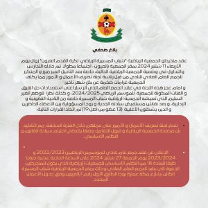 الإعلان عن عقد جمع عام عادي للموسمين الرياضيين 2022/2023 و 2023/2024 يوم الجمعة 27 شتنبر 2024 على الساعة الحادية عشرة صباحا طبقا للمادة 18 من النظام الأساسي للجمعيات الرياضية،الذي يخول للمنخرطين الدعوة إلى عقد الجمع العام العادي،و ذلك بمقر الجمعية الرياضية شباب المسيرة الكائن بشارع مكة عمارة بوجا الطابق الأول رقم 1بالعيون،وفق جدول الأعمال المحدد.