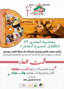 بوجدور تحتفي بالذكرى 49 للمسيرة الخضراء وتنظم الملتقى الجهوي الأول تحت شعار “من مسيرة تحرير الصحراء، إلى مسيرة التجديد والنماء”