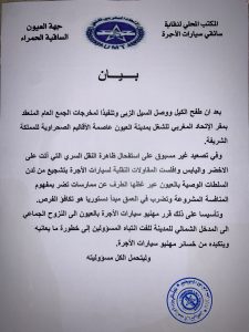 العيون -(الصحراء المغربية) أعلن مكتب النقابة المحلية لسائقي سيارات الأجرة في مدينة العيون عن قرار اتخذه السائقون للنزوح الجماعي إلى المدخل الشمالي للمدينة.