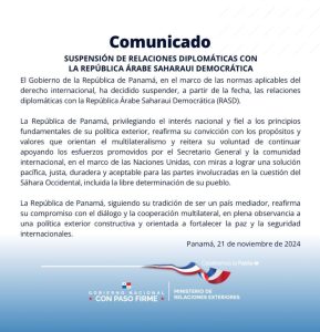أعلنت جمهورية بنما، في خطوة دبلوماسية بارزة، عن قرارها الرسمي بتعليق علاقاتها الدبلوماسية مع ما يسمى “الجمهورية العربية الصحراوية الديمقراطية”، وذلك في بلاغ رسمي صادر عن وزارة خارجيتها يوم الخميس، وأكدت الوزارة أن القرار يدخل حيز التنفيذ بأثر فوري، مستندة إلى مقتضيات القانون الدولي.