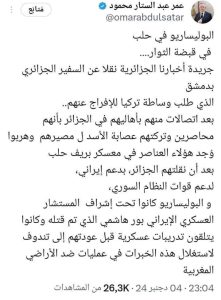 كشفت تقارير إعلامية وتصريحات صادرة عن البرلماني العراقي السابق عمر عبد الستار محمود عن مشاركة عناصر من جبهة البوليساريو الانفصالية في تدريبات عسكرية معقدة داخل الأراضي السورية، حيث أُجريت هذه التدريبات تحت إشراف المستشار الإيراني “بور هاشمي” وبدعم مباشر من الجزائر، تمركزت العناصر في معسكر بريف حلب شمال سوريا، حيث تلقوا تدريبات متقدمة تهدف إلى اكتساب خبرات قتالية تؤهلهم لتنفيذ عمليات محتملة ضد الأراضي المغربية، في إطار مخططات استراتيجية أوسع تستهدف زعزعة استقرار المنطقة وتعزيز النفوذ الجيوسياسي للجزائر وإيران.