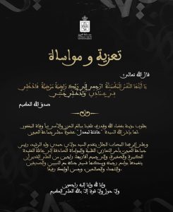 وبهذه المناسبة الأليمة، يعرب السيد مولاي حمدي ولد الرشيد عن خالص تعازيه القلبية ومواساته الأخوية لأسرة الفقيدة الكريمة، ولزملائها في المجلس الجماعي للعيون، ولكل معارفها وأحبائها، راجيا من العلي القدير أن يشملها بواسع رحمته، ويغفر لها، ويسكنها فسيح جناته مع النبيين والصديقين والشهداء والصالحين، وأن يلهم ذويها جميل الصبر والسلوان في هذا المصاب الجلل.