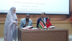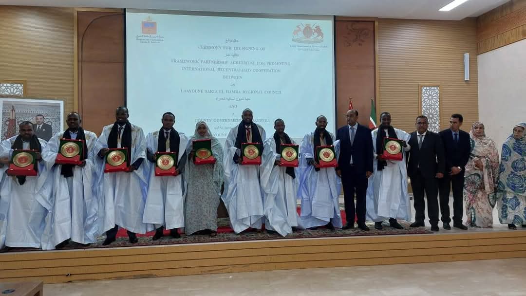 شهد مقر ولاية جهة العيون الساقية الحمراء ، صباح اليوم الخميس 20 فبراير الحالي. حفل توقيع إتفاقية إطار للشراكة من أجل تعزيز سبل التعاون اللامركزي الدولي. بين رئيس جهة العيون الساقية الحمراء السيد سيدي حمدي ولد الرشيد من جهة، و رئيس مقاطعة مناديرا بجمهورية كينيا السيد محمد عدنان خليف.